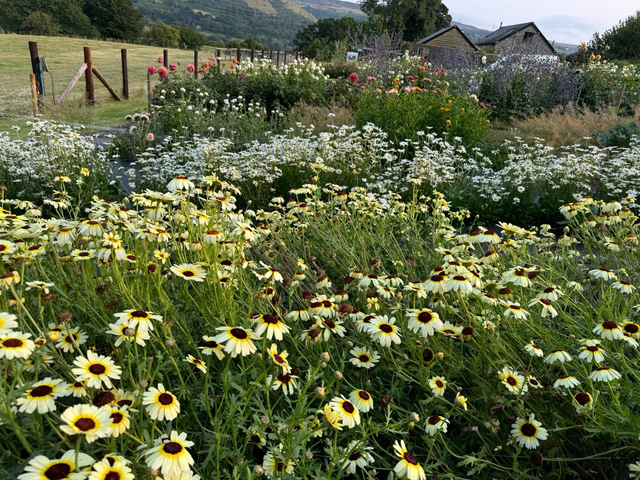 Stroll through the vibrant flower field, alive with colourful, seasonal blooms, while taking in the stunning views of the Usk Valley.
